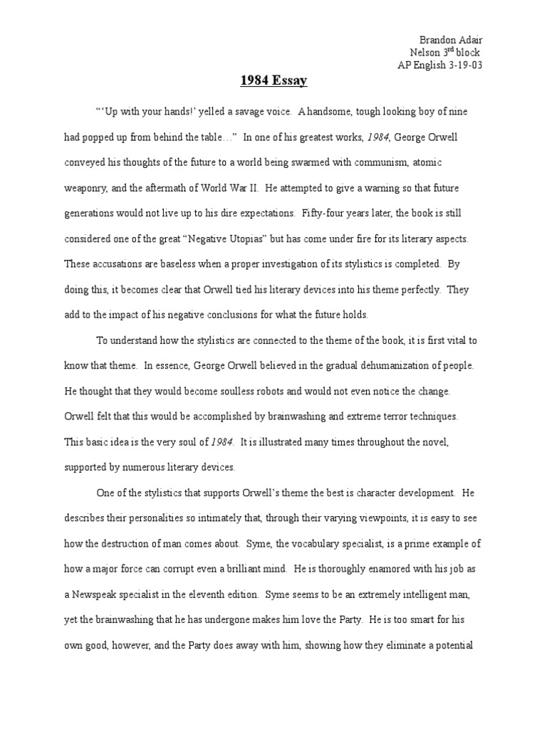 George Orwell’s Essay. George Orwell’s novel demonstrates a dystopian society and explains the nature of totalitarian government, using extensive imagery. Orwell shows the anti-utopian regime from the perspective of a civil worker — Winston. He is an outer party member whose job is to rewrite blogger.comted Reading Time: 10 mins George Orwell’s writes of a dystopian society that has become severally oppressed by the methods ‘The Party’ uses to control its society. The people do not think for themselves, and there is no independence from the government’s rules. One form that the party has control over everyone is with mind manipulation and constant surveillance, [ ] · by George Orwell Essay., “George Orwell once offered this definition of heroism: ordinary people doing whatever they can to change social systems that do not respect human decency, even with the knowledge that they can’t possibly succeed. ” In George Orwell’s novel, , the protagonist, Winston Smith is described in words of being the Estimated Reading Time: 6 mins